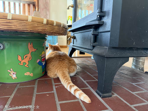 「まっちゃん」が薪ストーブと灰入れバケツの間に陣取ってるんやけど着火剤にするミカンの皮とオヤツ用のカボチャを干してるカゴの下・・・ここに置···