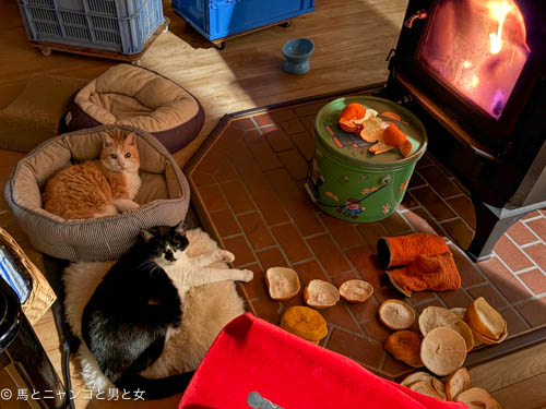 積雪量が少なくなったとはいえまだ最低気温4℃。 夜の薪ストーブはかかせない。 薪ストーブの熱で乾かしてるモノ。 焚き付け用のデコポンの皮 風···