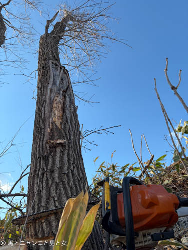 昨日も きこりなσ(^^;)。 あと2本だけ畑の横の木を切っといてくれとの司令。 左側が崖 足場がないのでいつもとは違う方向からチェーンソーを入···