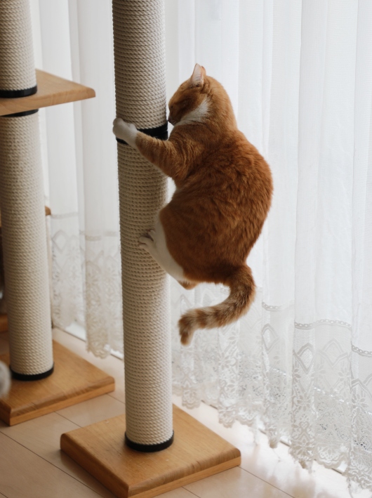 キャットタワーのアミ姐さんのいる場所まで行きたかったのに木登りの勢いが足りず途中で止まってしまったユウ。 しっぽをぶんぶん振りながらどうした···