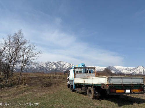 なんちゃっ邸の隣のKさんの畑にとめてた4トンロングのトラック。 昨日は風が強かったけど良い天気 日高山脈がきれいやった。伐採現場に9時集合と···